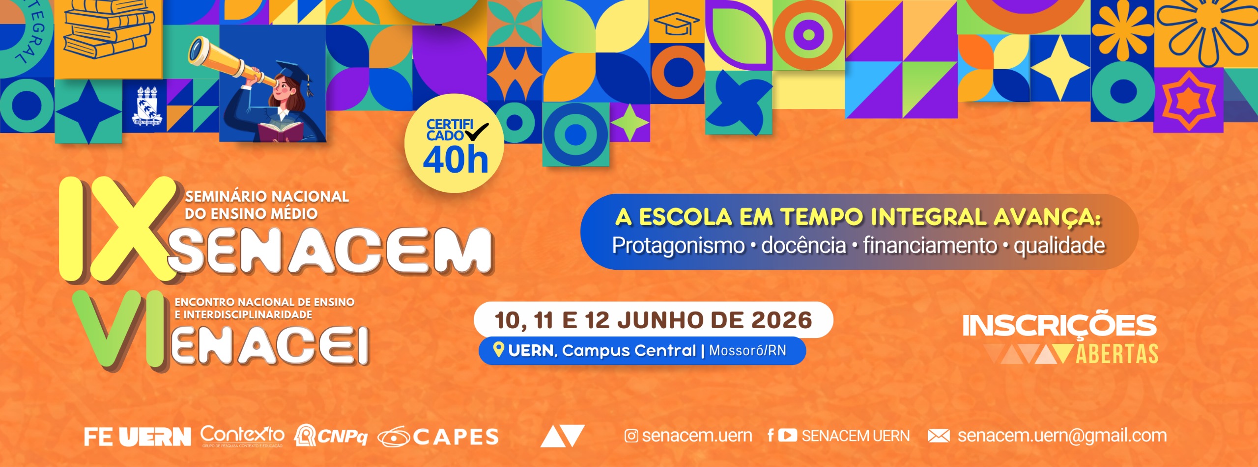 O VIII Seminário Nacional do Ensino Médio (SENACEM) e o III Seminário Interdisciplinar se juntam para discutir temas relacionados à educação, ao ensino, a trans/multi/interdisciplinaridade e à formação humana em estreita relação com os processos de construção de uma sociedade mais justa e igualitária. Os eventos, promovidos pela Faculdade de Educação da Universidade do Estado do Rio Grande do Norte (FE/UERN), pelo Grupo de Pesquisa Contexto e Educação (CNPq/UERN), pelo Programa de Pós-Graduação em Ensino (POSENSINO – UERN/UFERSA/IFRN) e pelo Programa de Pós-Graduação em Ciências Sociais e Humanas (PPGCISH), conta com os apoios do Conselho Nacional de Desenvolvimento Científico e Tecnológico (CNPq), da Coordenação de Aperfeiçoamento de Pessoal de Nível Superior (CAPES), da Universidade Federal Rural do Semi-Árido (UFERSA), do Programa de Educação Tutorial (PET Pedagogia/UERN), do Instituto Federal de Educação, Ciência e Tecnologia do Rio Grande do Norte (IFRN), da Universidade Federal Rural do Semi-Árido (UFERSA), do Programa de Pós-Graduação em Educação (POSEDUC/UERN) e da Publique Coletivo.